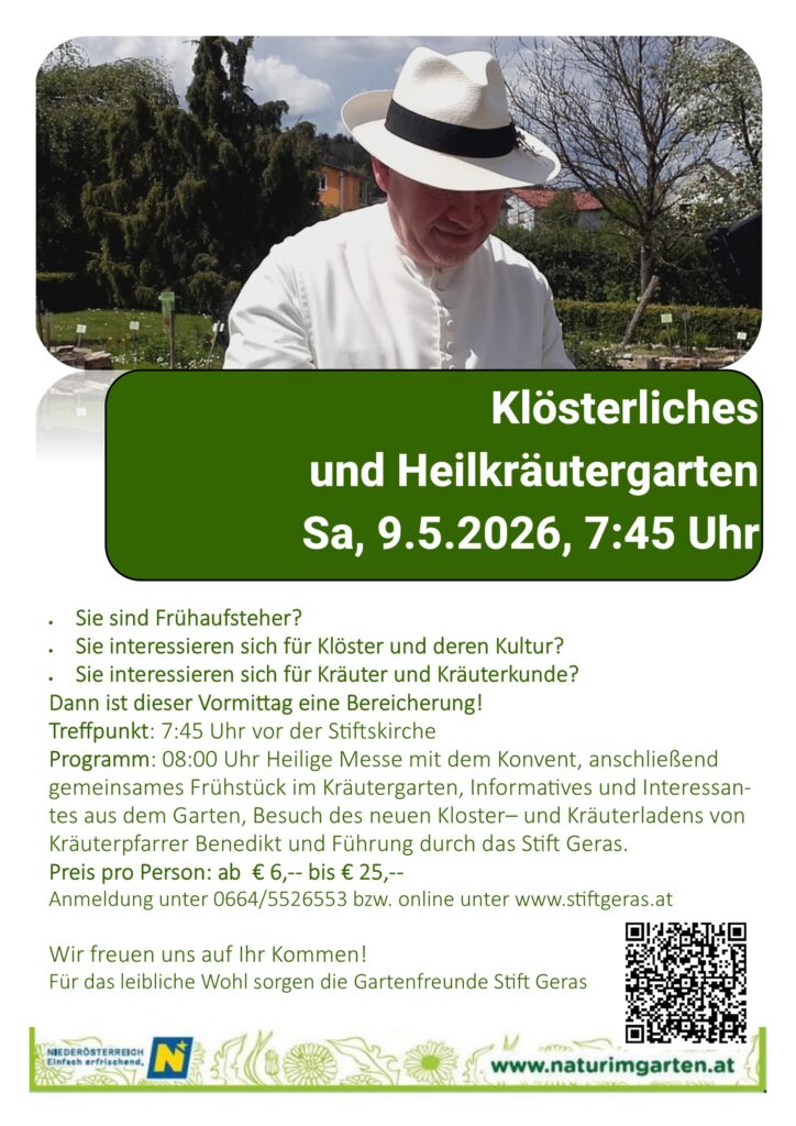 gemeinsames Frühstück im Kräutergarten, Informatives und Interessantes aus dem Garten, Besuch des neuen Kloster– und Kräuterladens von Kräuterpfarrer Benedikt und Führung durch das Stift Geras.